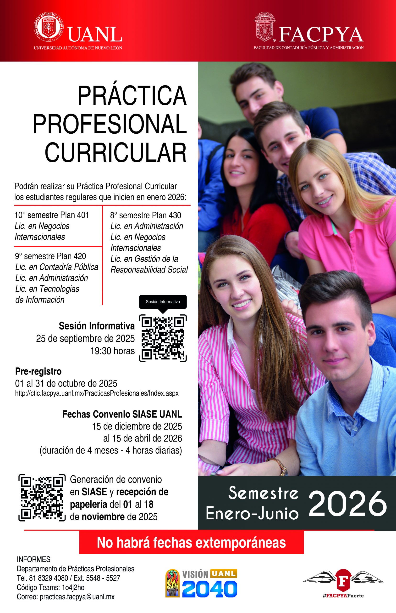 La Facultad de Contaduría Pública y Administración invita a los alumnos a revisar la convocatoria para realizar sus prácticas profesionales curriculares en el periodo enero – junio 2026.