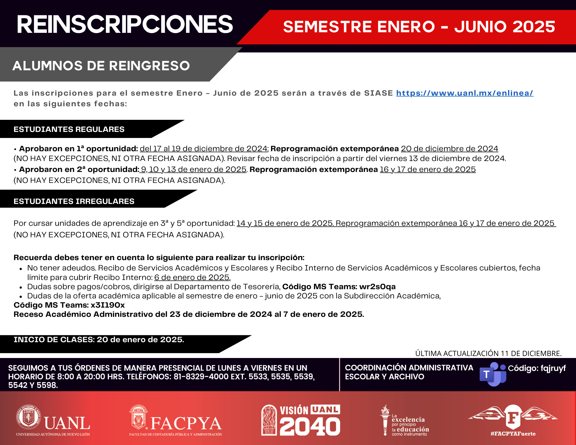 La Facultad de Contaduría Pública y Administración te invita a conocer las fechas de reinscripción para el semestre enero – junio 2025. Toda la información se encuentra en el apartado “Documentos relacionados”.