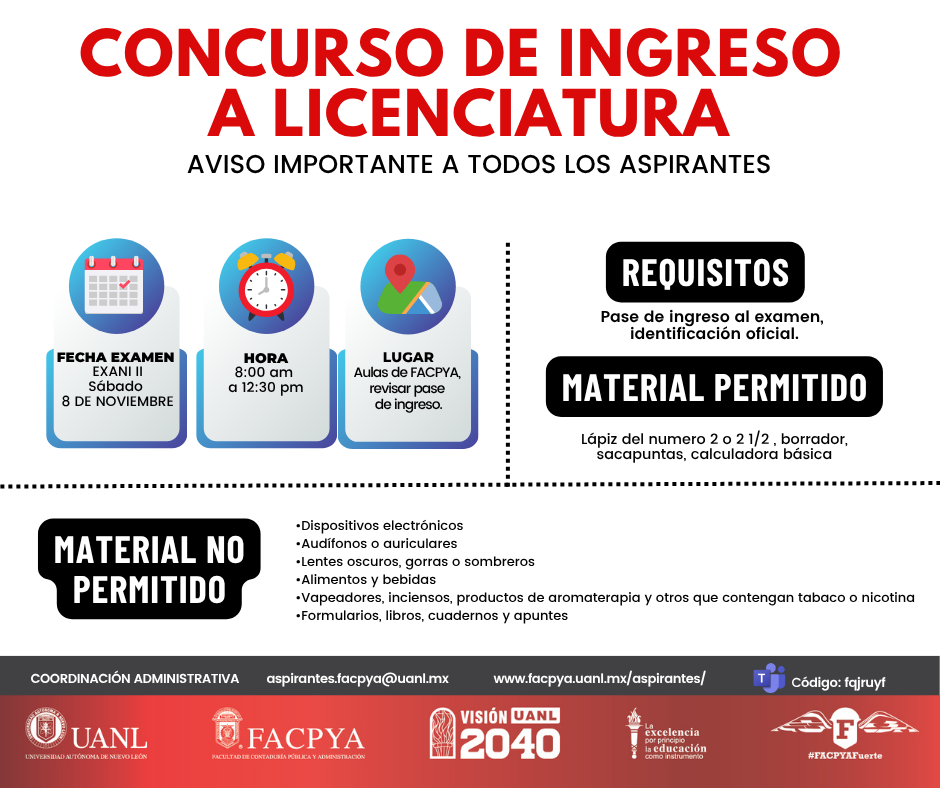 La Facultad de Contaduría Pública y Administración invita a los aspirantes a consultar los materiales permitidos e información importante para el examen EXANI II de este próximo sábado 08 de noviembre del 2025.