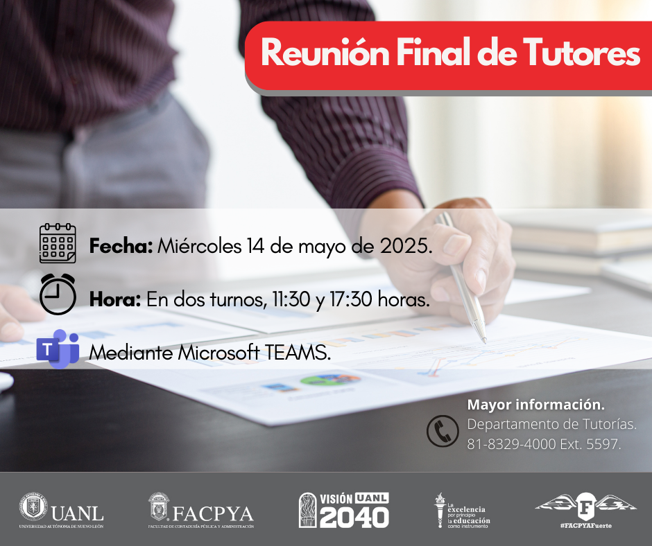 La Facultad de Contaduría Pública y Administración de la UANL invita a la comunidad a participar en la reunión final de tutores, la cual se llevará a cabo el día miércoles 14 de mayo del año en curso.