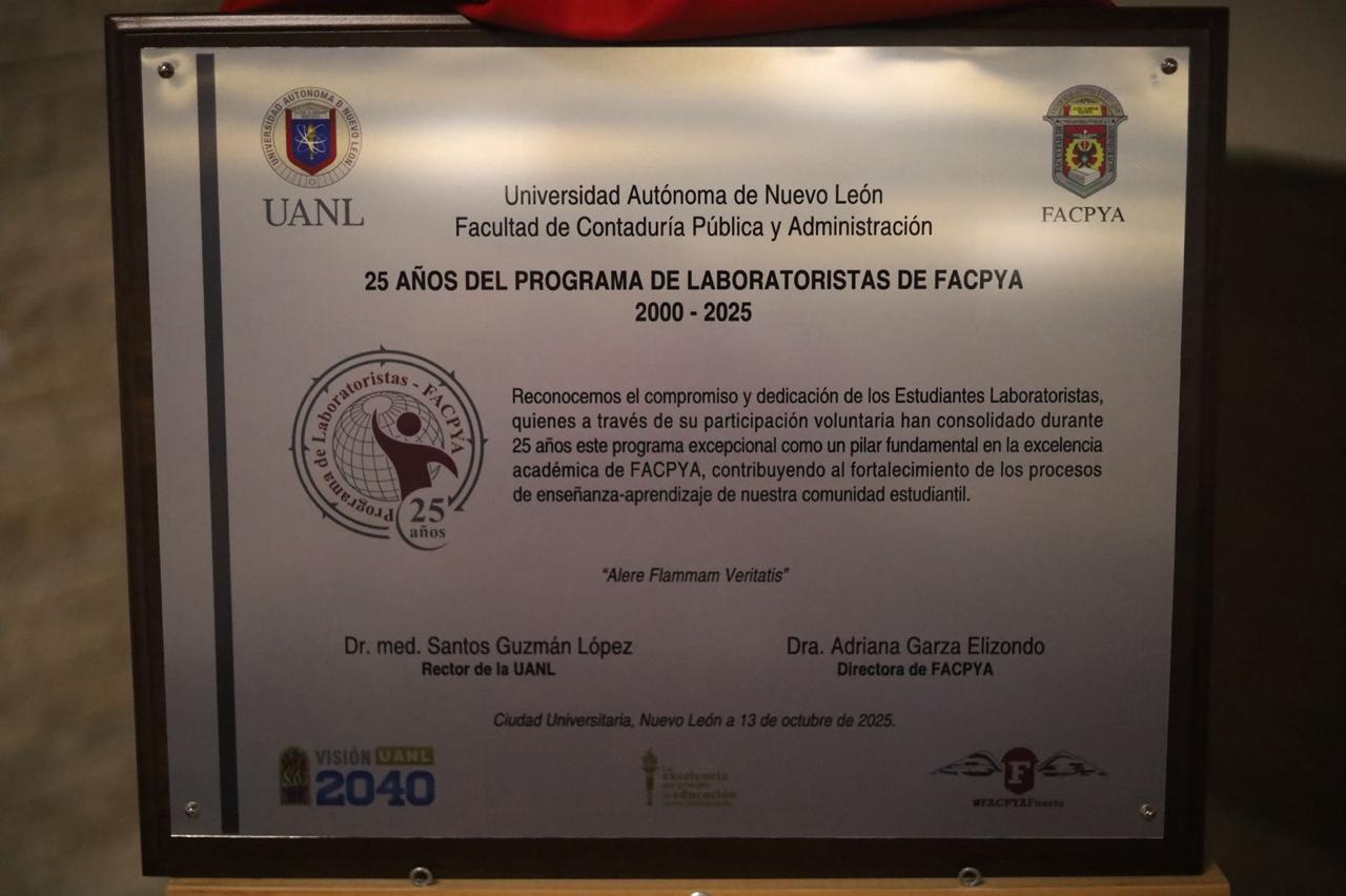 En el marco del 73° aniversario, la Facultad de Contaduría Pública y Administración de la UANL realizó la ceremonia conmemorativa de los 25 años del Programa de Laboratoristas, reconociendo dos décadas y media de contribución a la formación académica de miles de estudiantes.