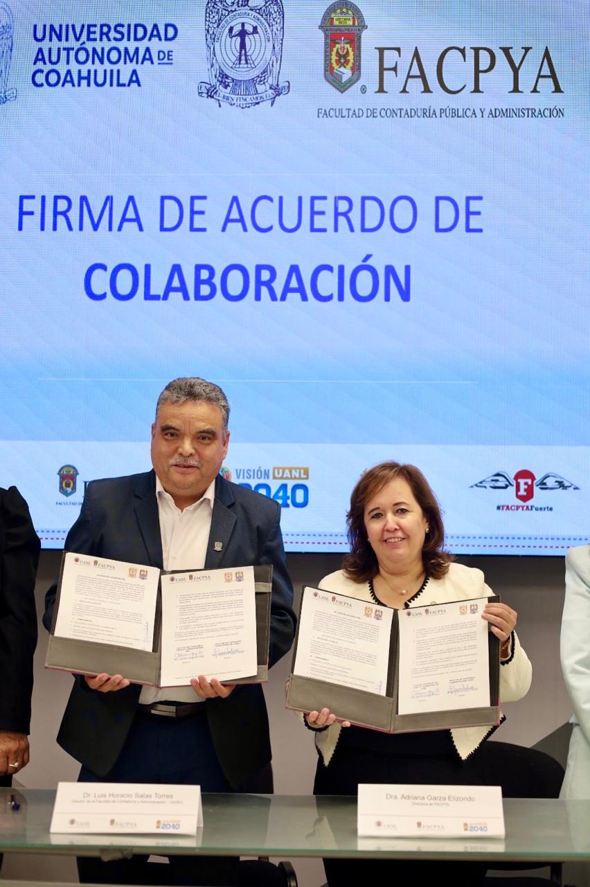 La Facultad de Contaduría Pública y Administración de la UANL formalizó ayer una alianza estratégica con la Facultad de Contaduría y Administración de la Universidad Autónoma de Coahuila, con el objetivo de fortalecer la colaboración académica y avanzar conjuntamente en proyectos de alto impacto.